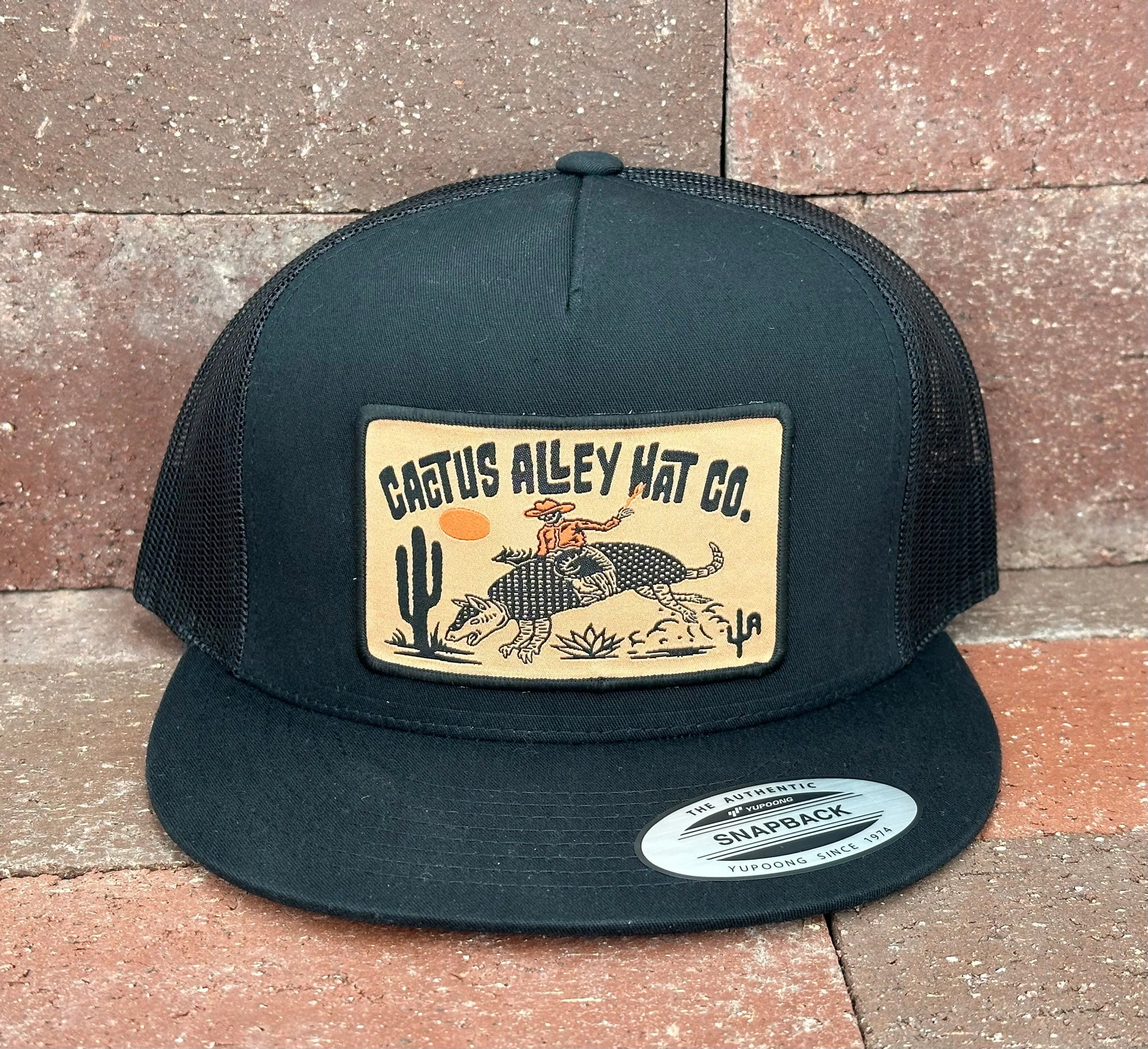 5 panel, 6006 style snapback hat in black with black mesh featuring our "Buckin Dillo" patch!