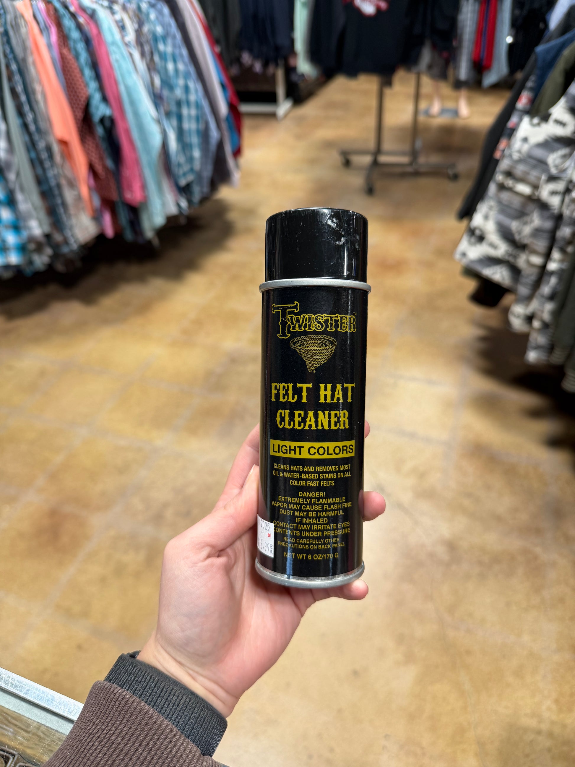 Twister Felt Hat Cleaner by M & F Western Products cleans hats and removes most oil and water based stains on color-fast felts and fabrics. This formula is specifically designed for use on light colored felts hats and other fabrics. 6 oz. Proudly made in USA.