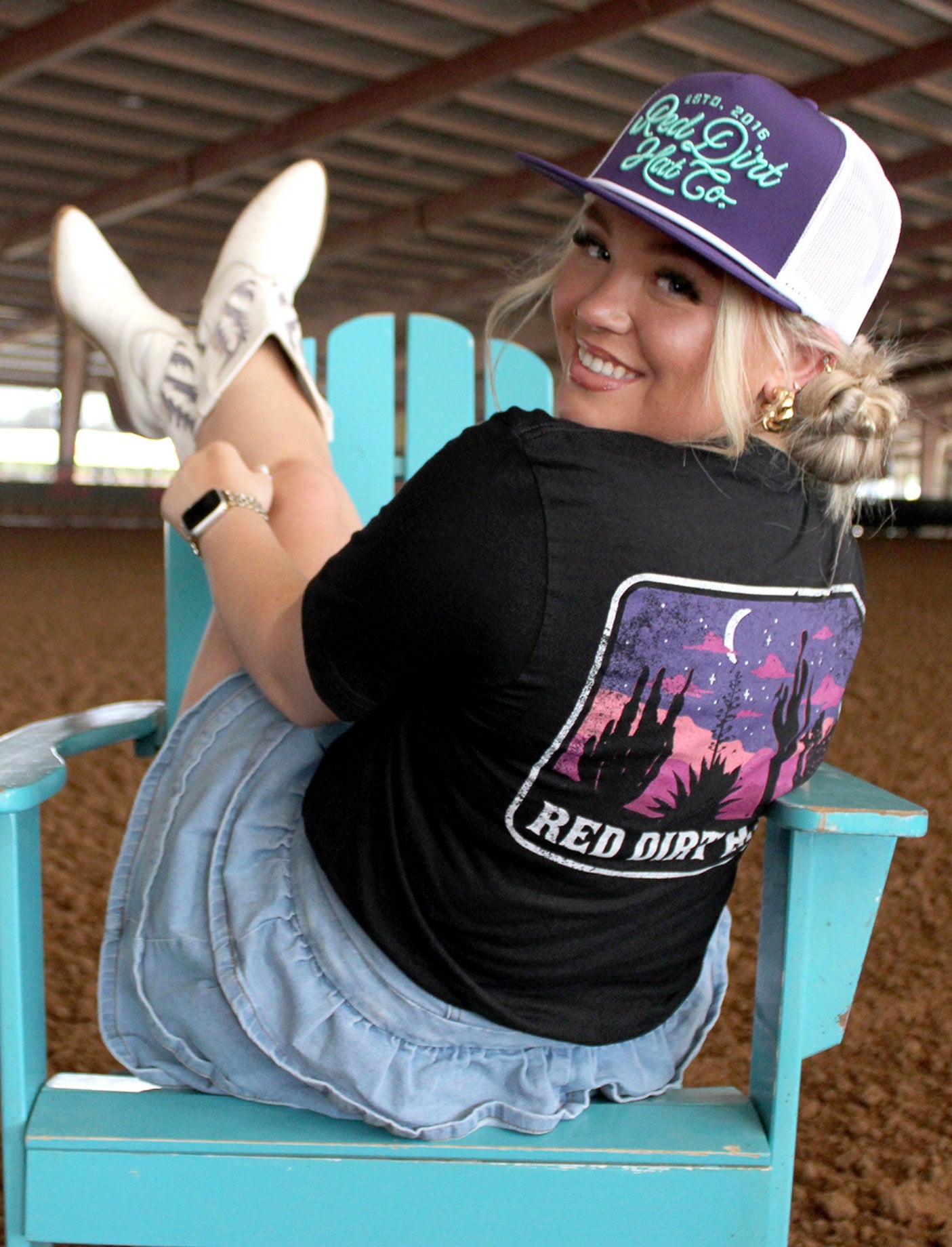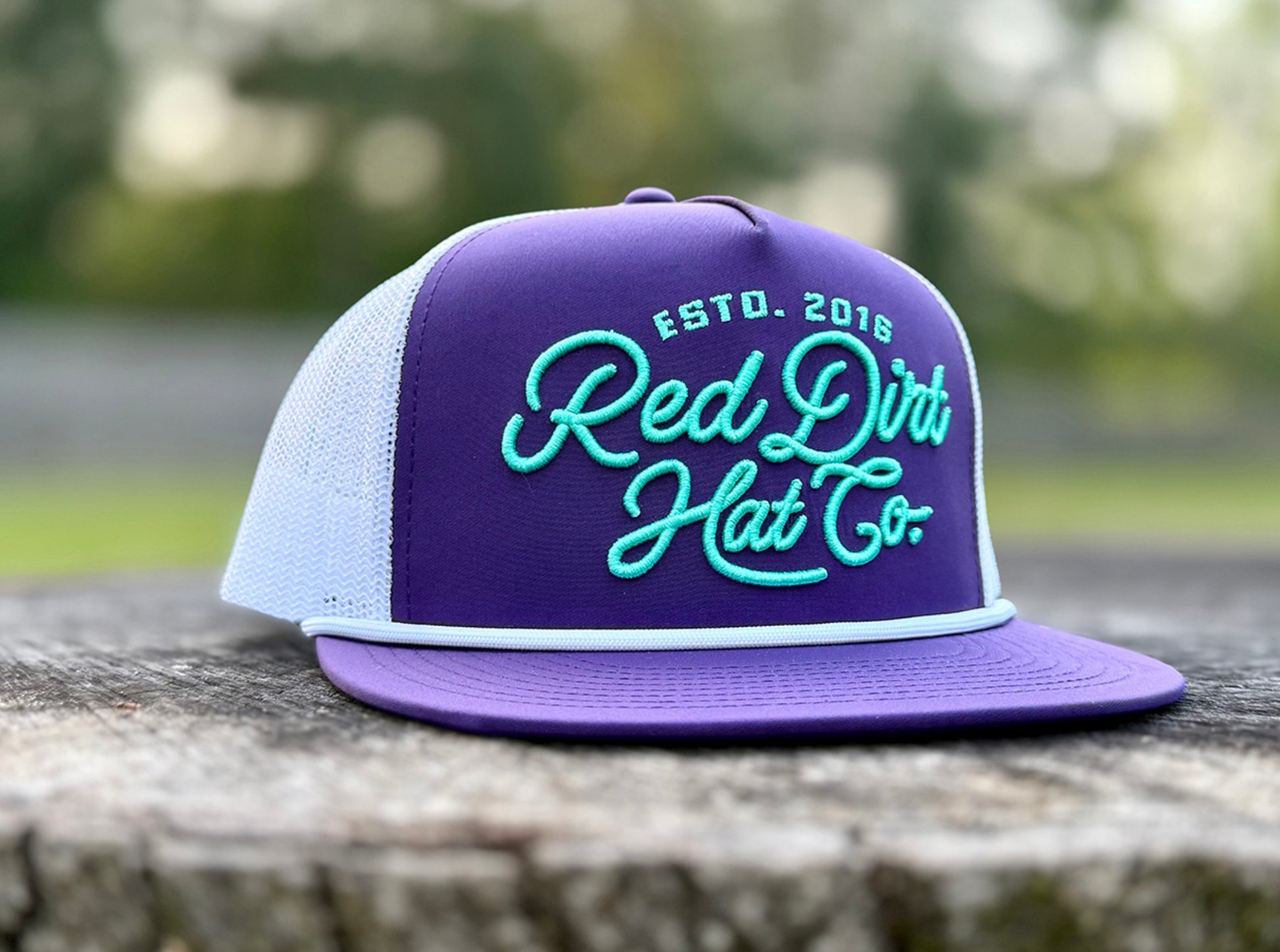 Purple/White with white rope Classic 5 panel flat bill style snapback cap featuring the “Lariat” direct stitching.