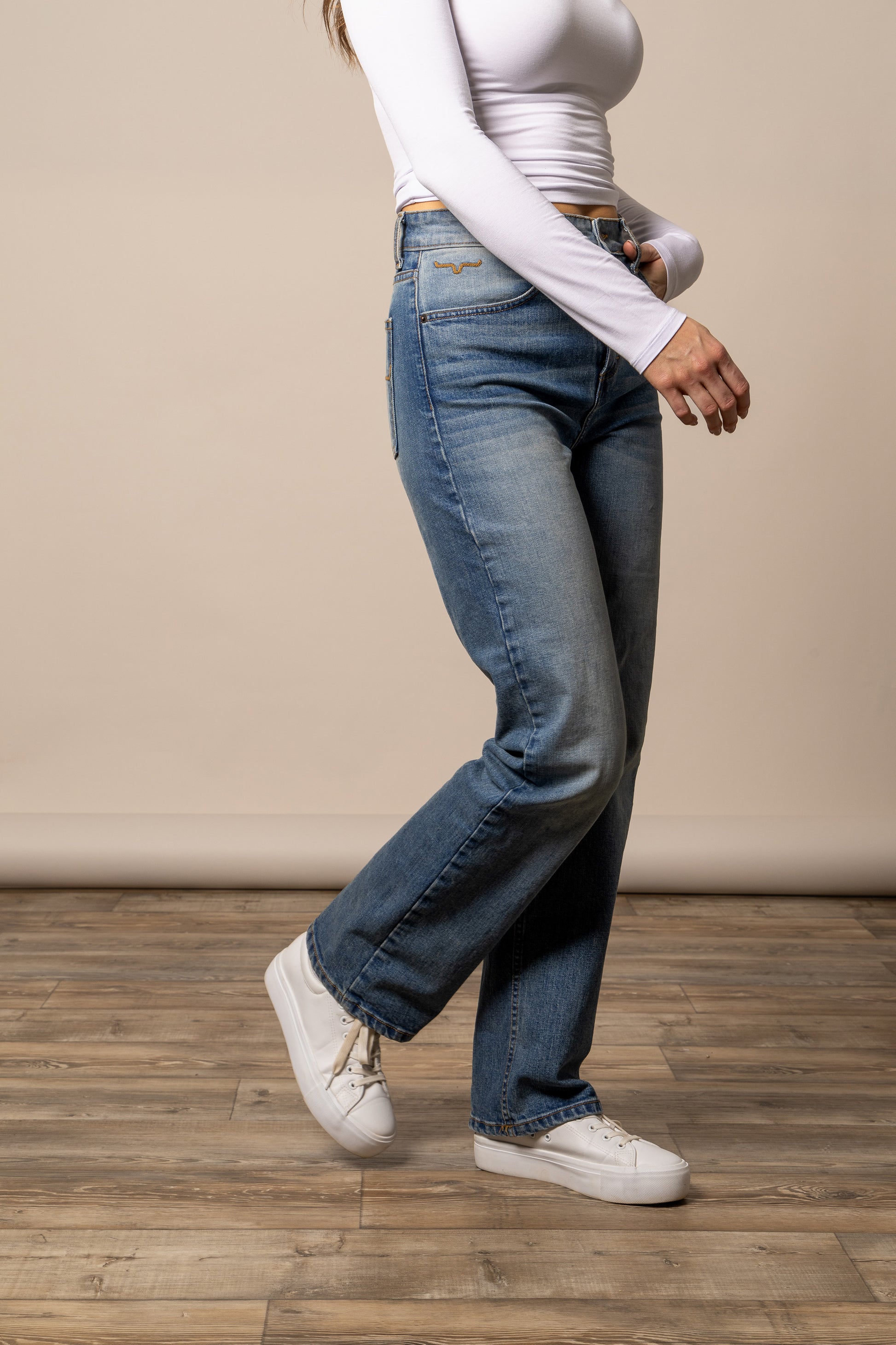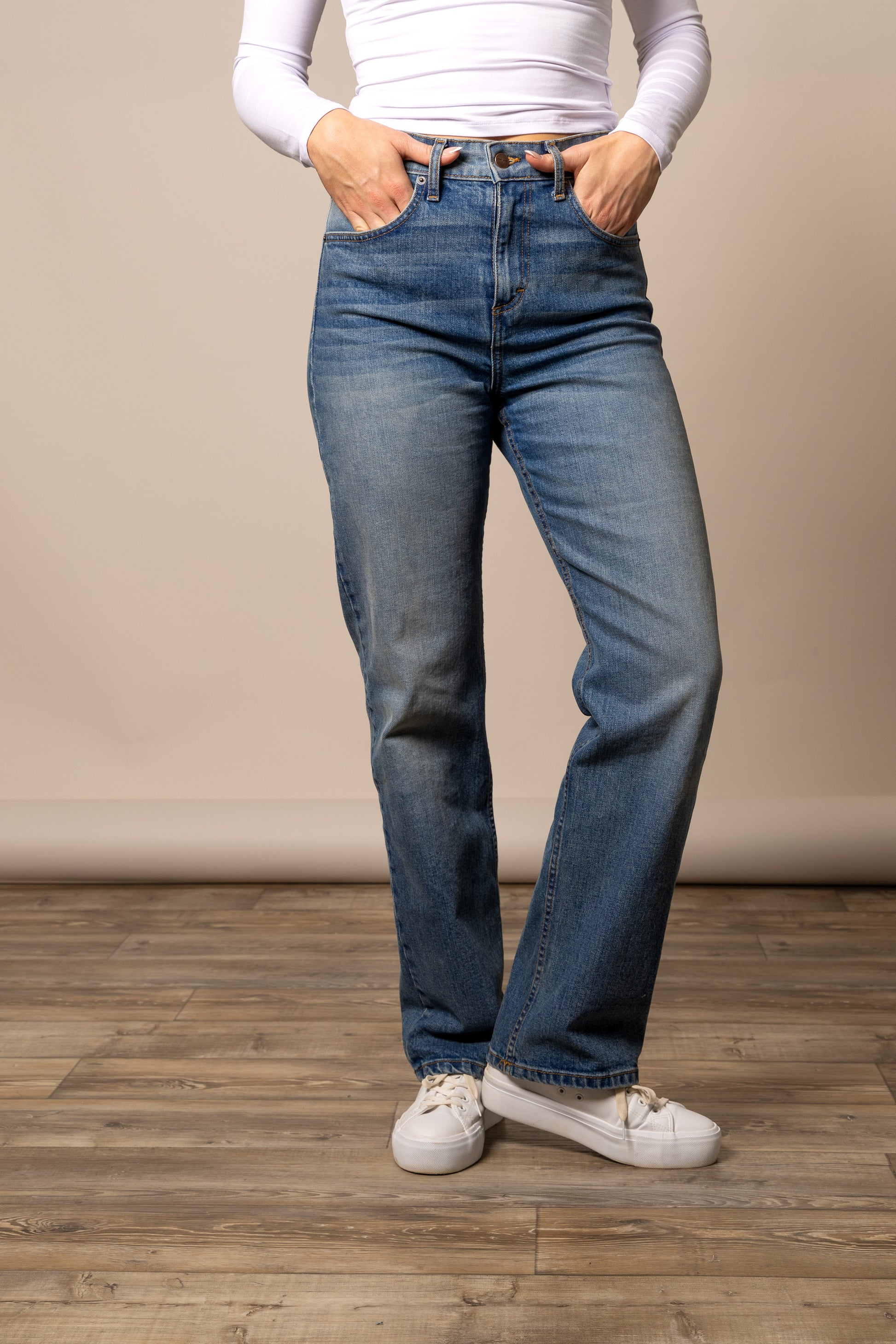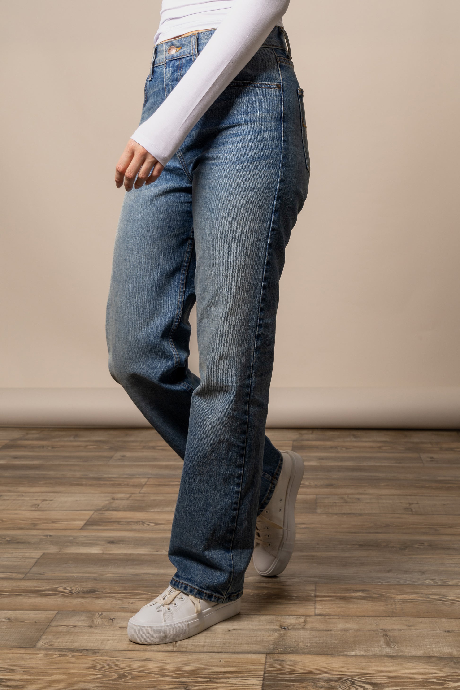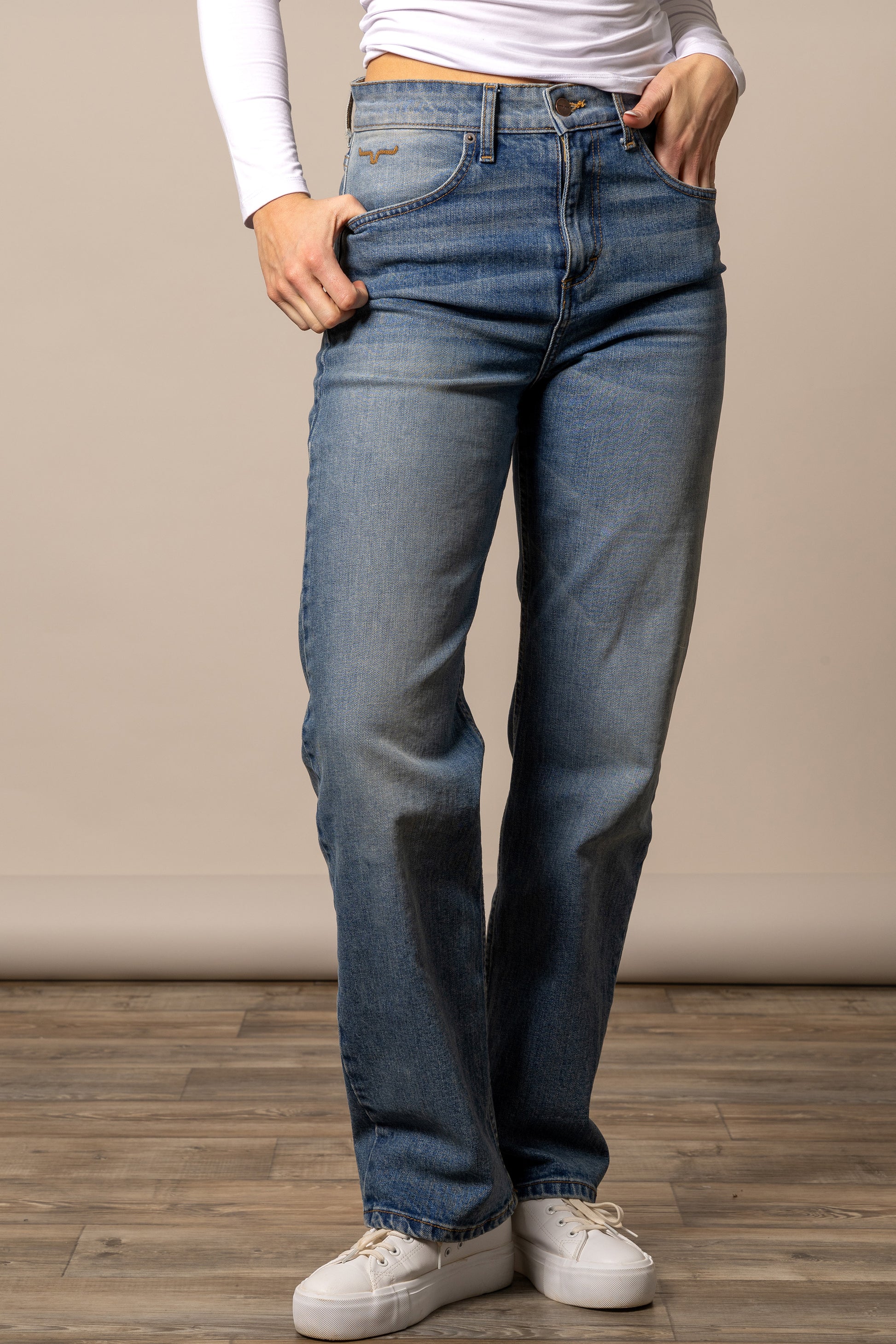 High-rise, loose fitting straight leg, featuring a boot size opening.