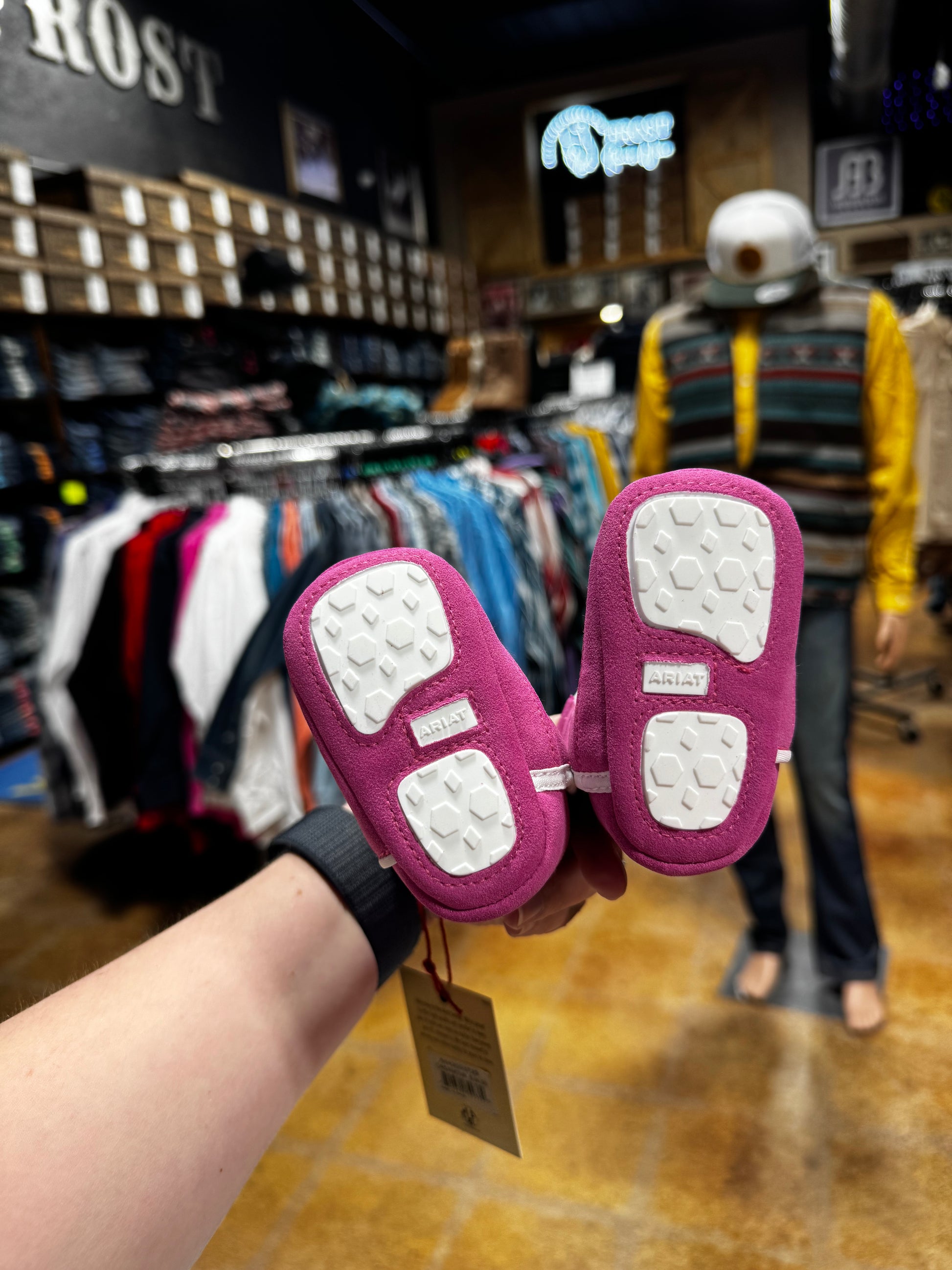 Your little one is sure to love these Ariat LIL’ STOMPERS infant boots by M&F Western Products. Hot pink roughout man made material body with white stitching. Side velcro closure for easy on/off. So comfortable that your little cowpoke will want to wear them all day.