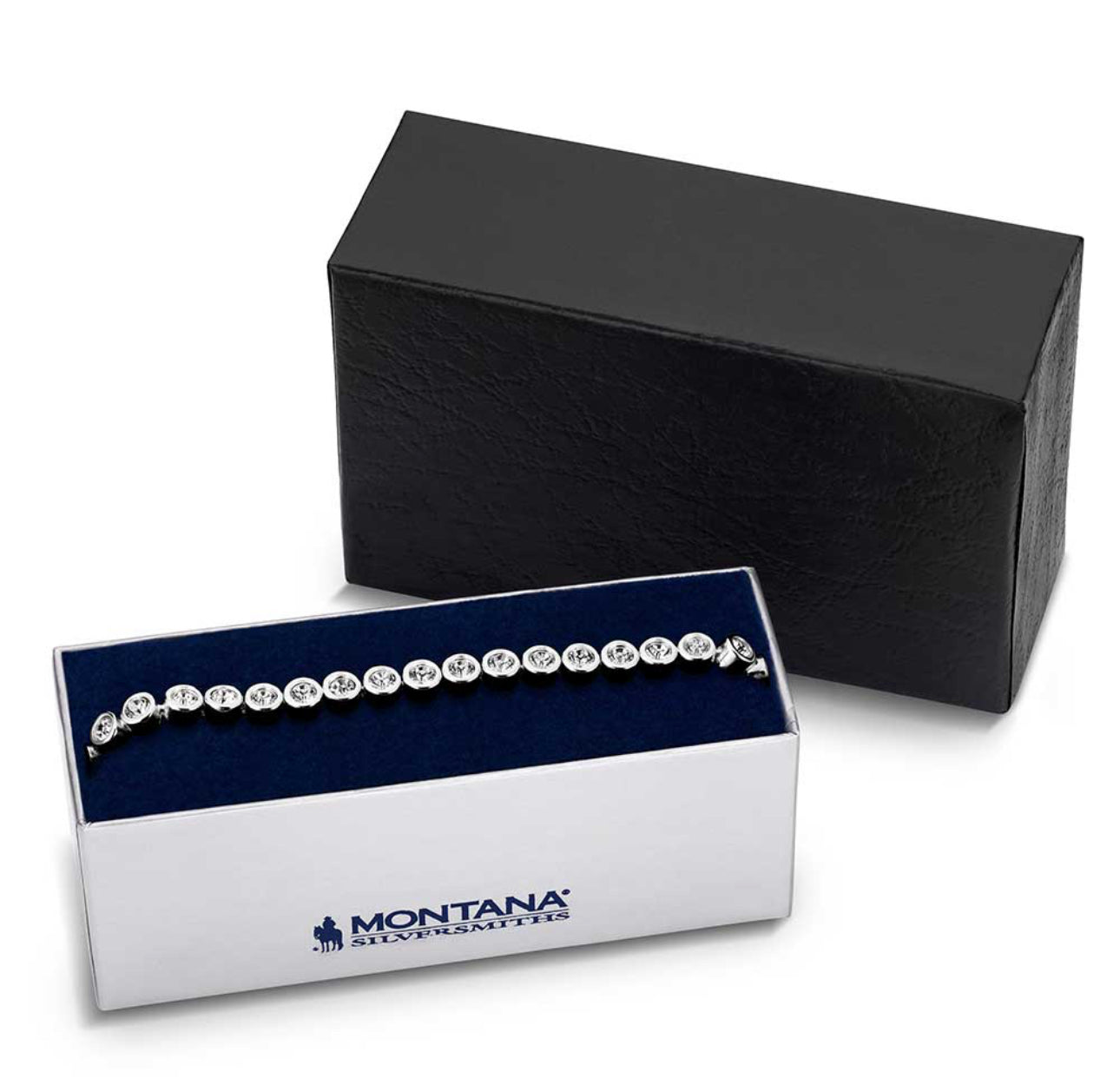Silver over brass. Cubic zirconia. Montana Armor to prevent tarnish.