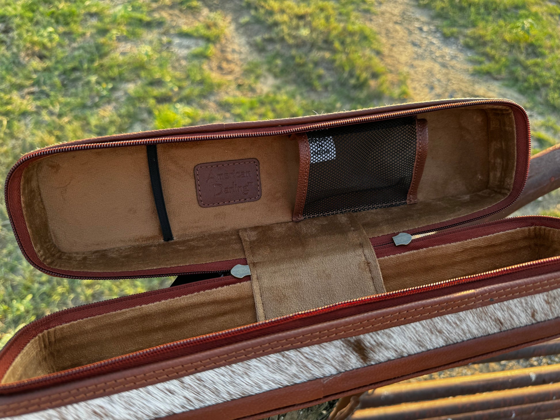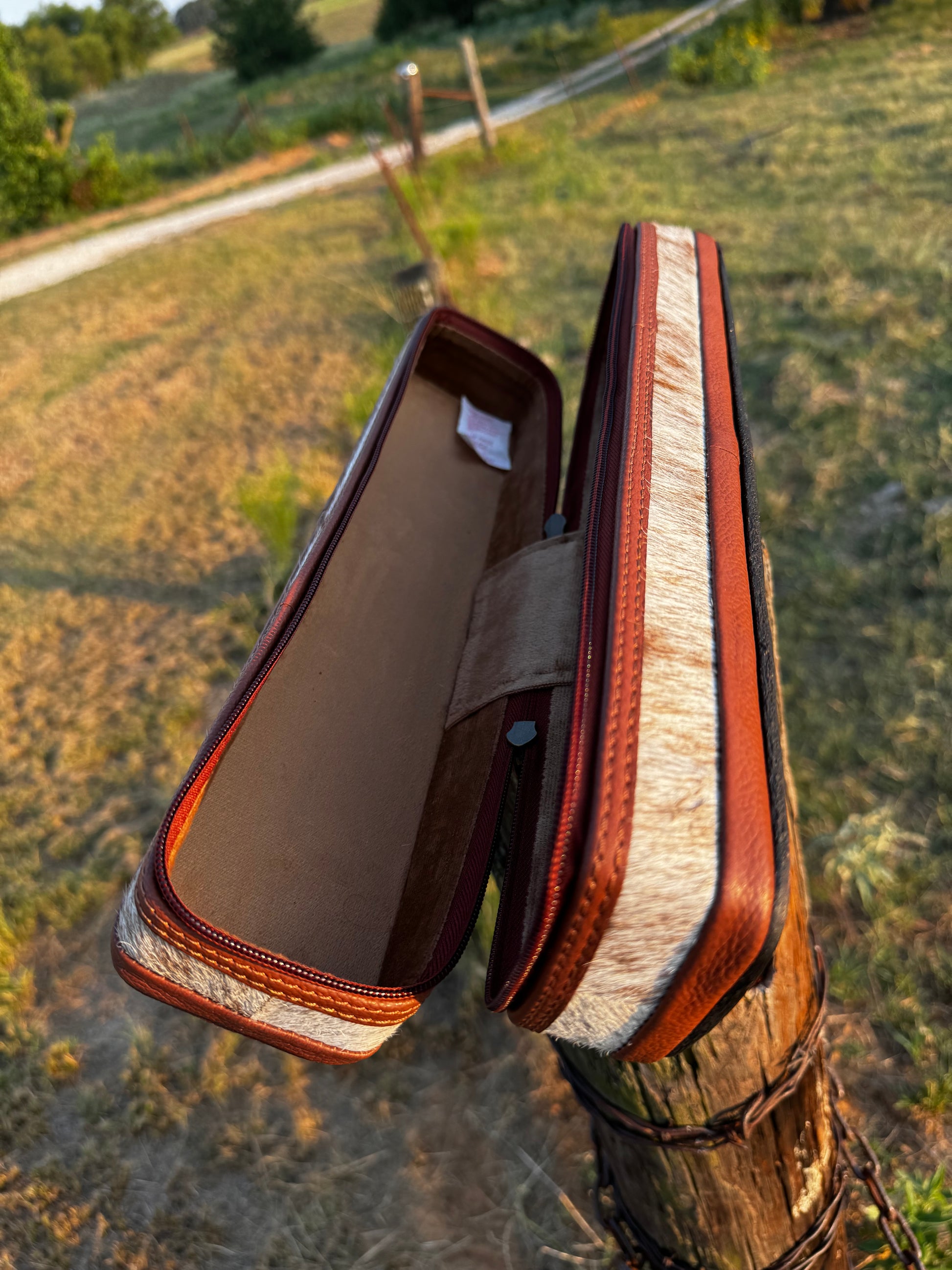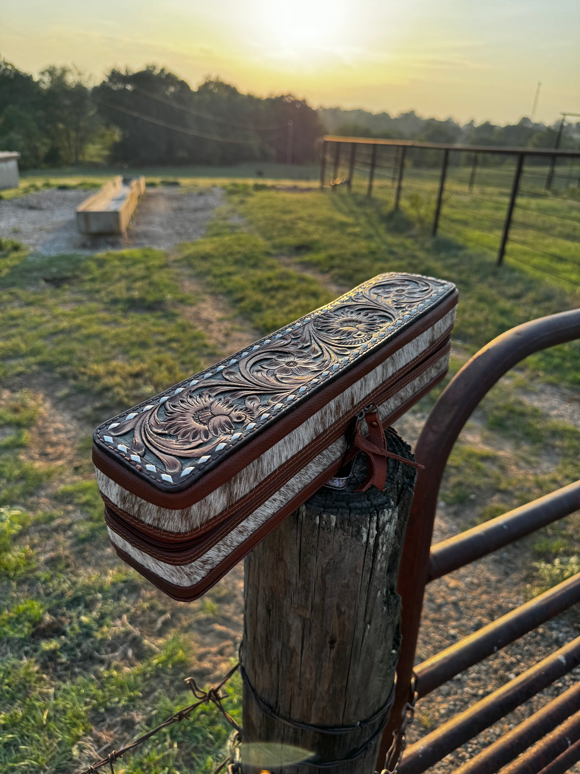 Tooled leather and cowhide hair straightener and curling iron traveling bag