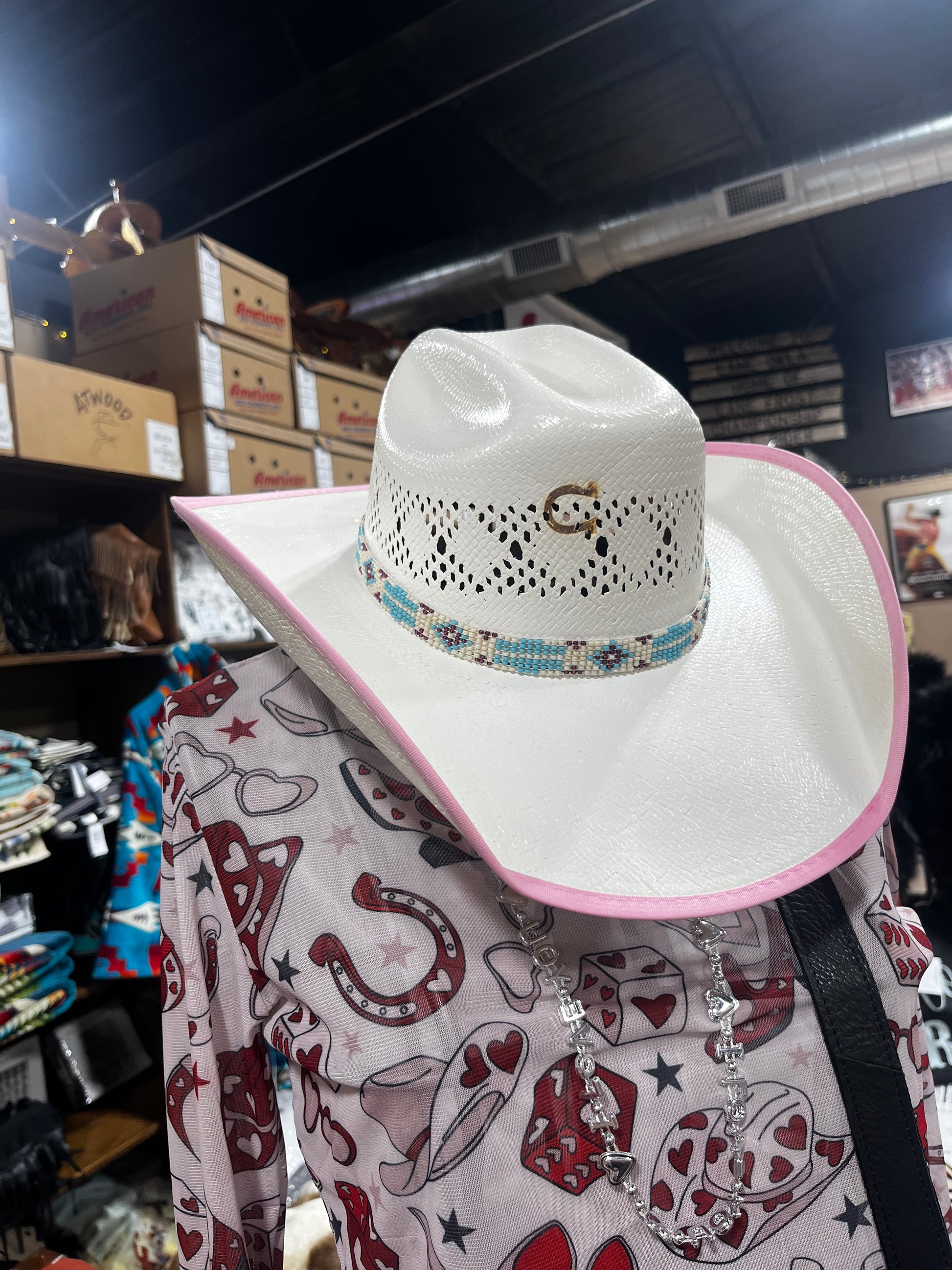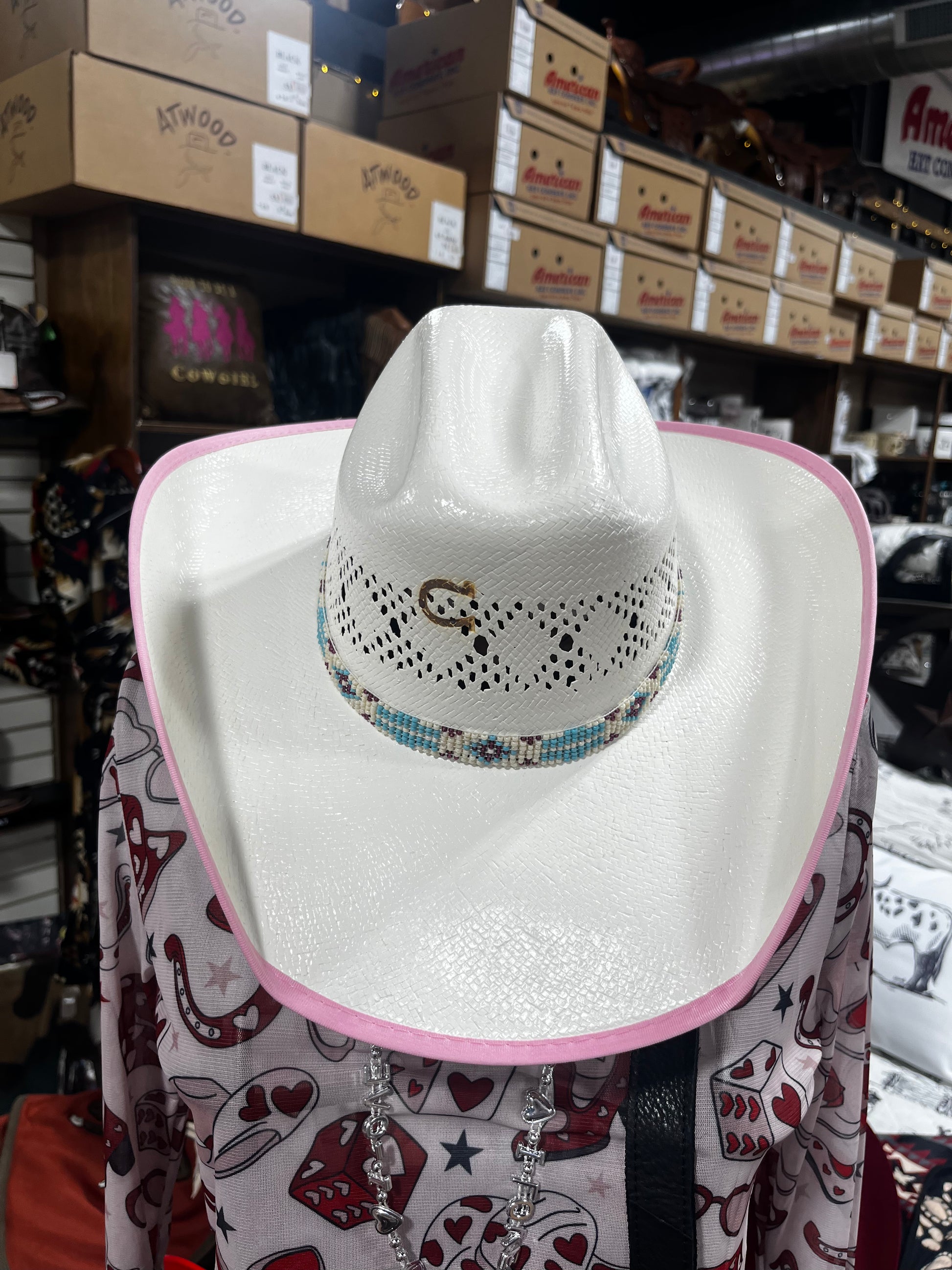 Youth one size straw hat with a pink border brim and a beaded hat band