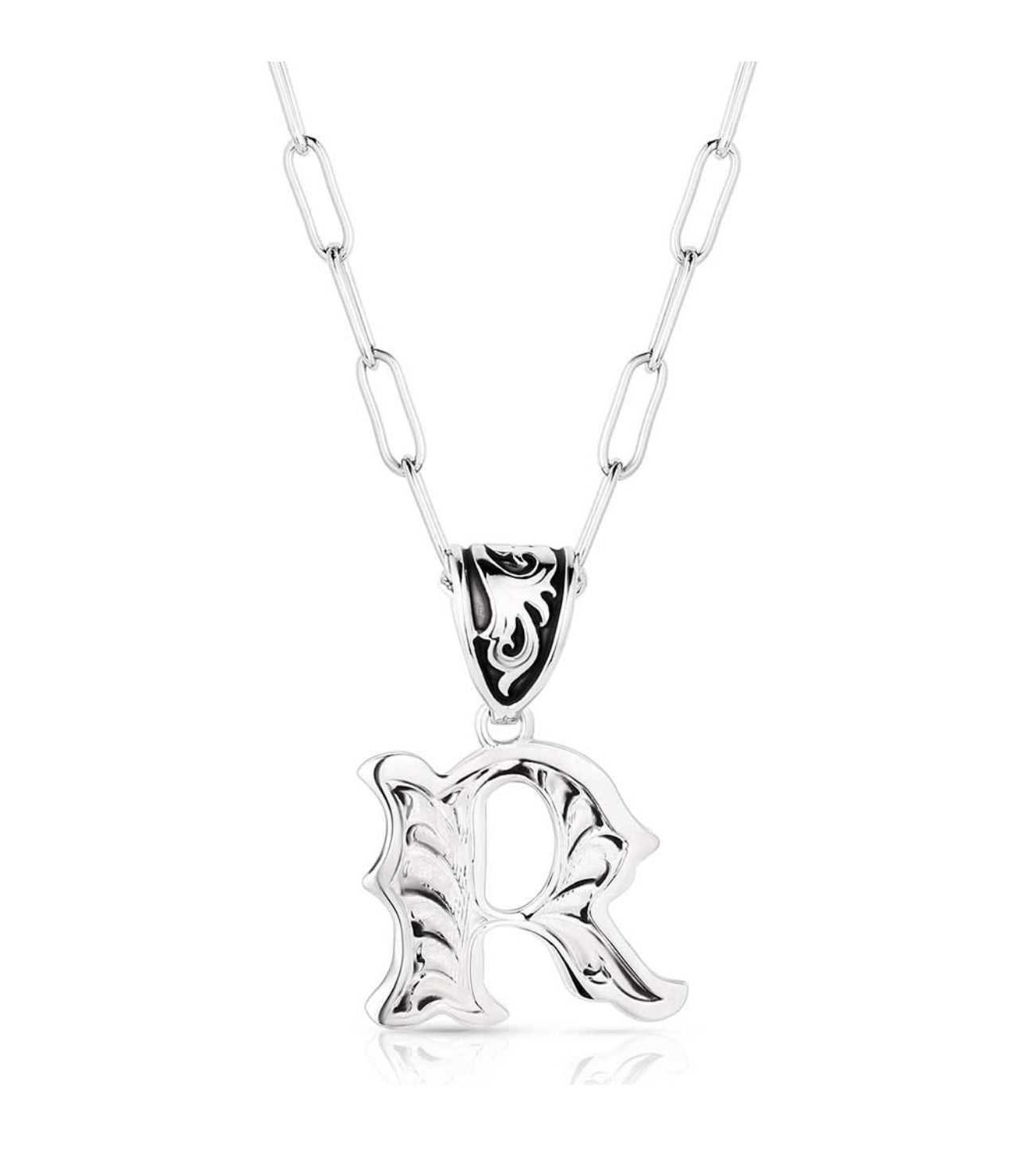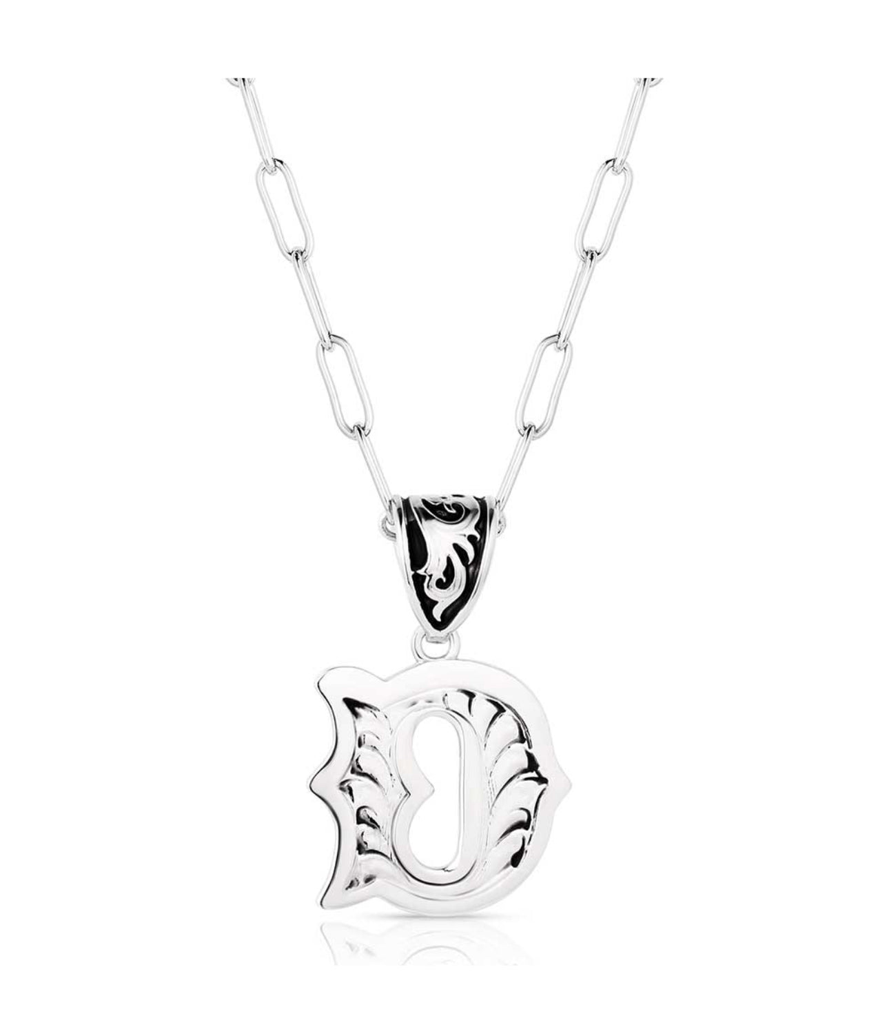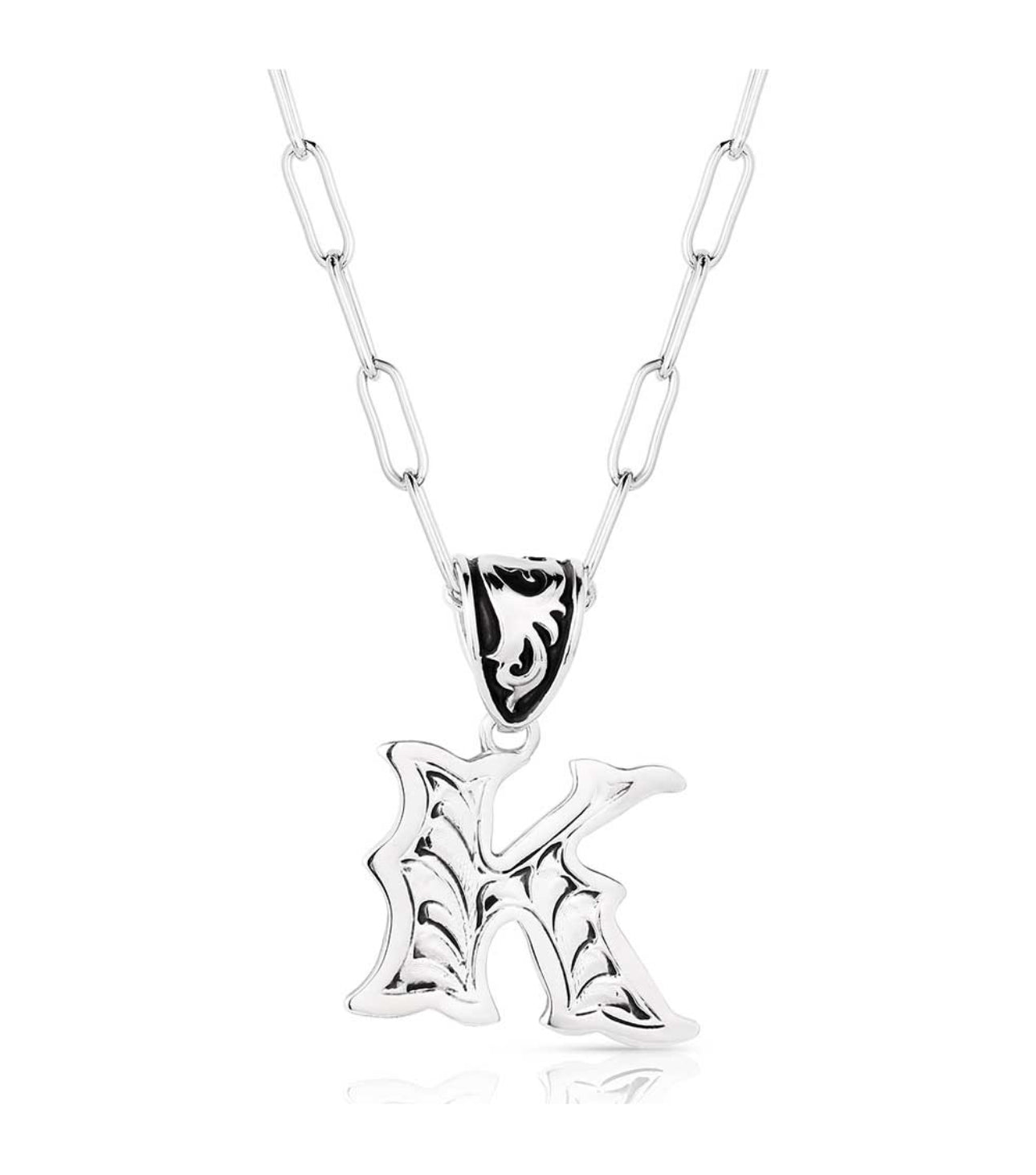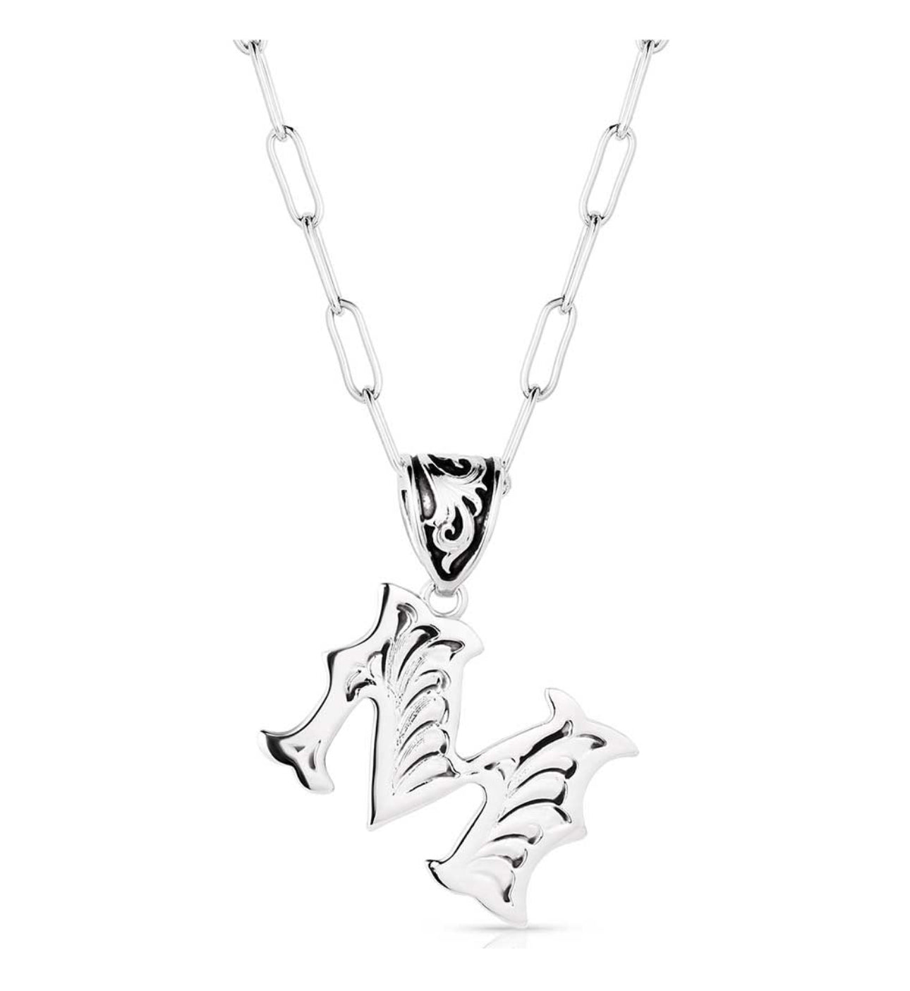 Wear an accessory as individual as you. The Western Initial necklace is silver toned and antiqued with classic engraving throughout. The pendant is attached to a paperclip chain with a fully embellished bail and black paint to make the details pop. This necklace has 18 inch adjustable chain.