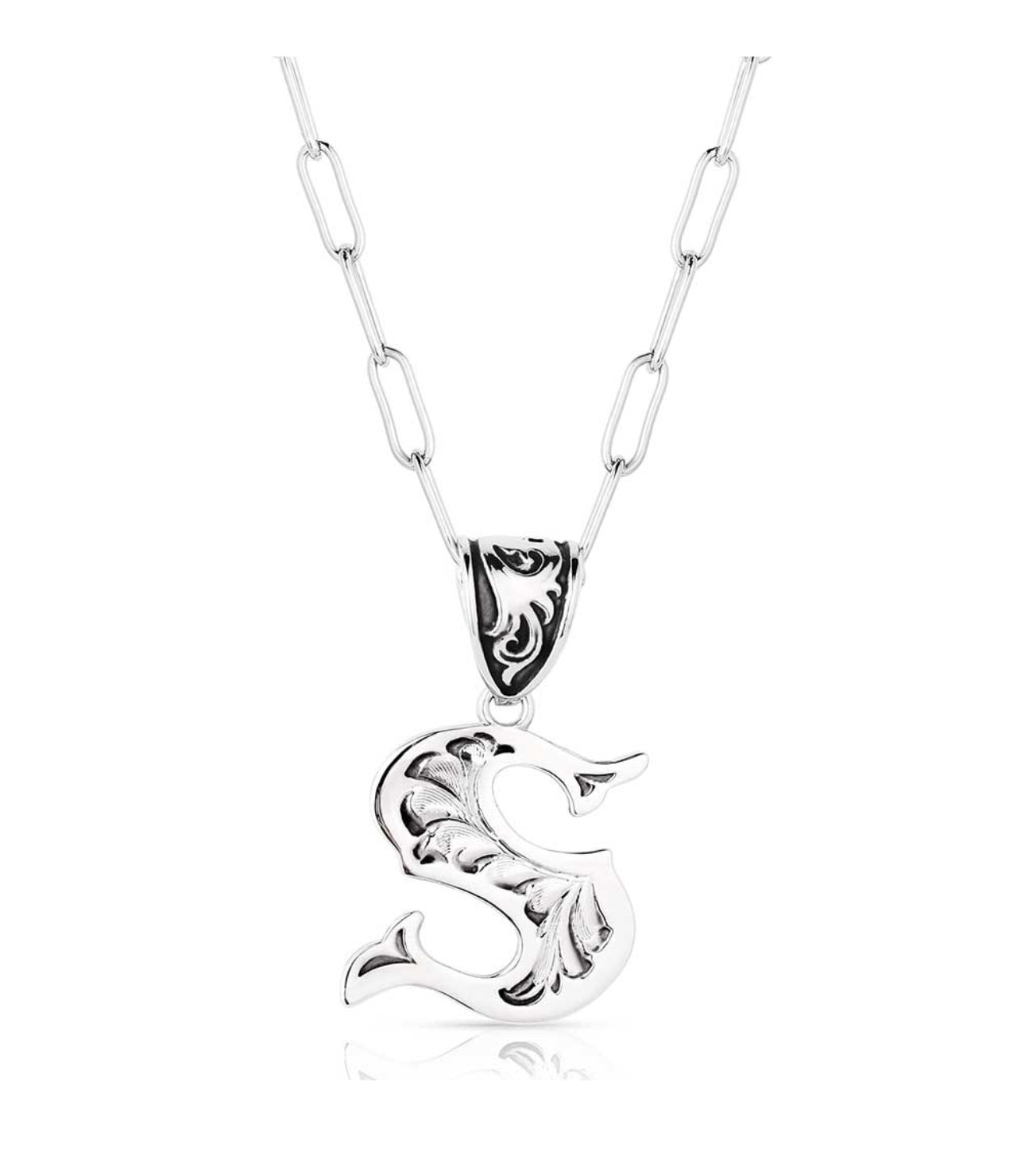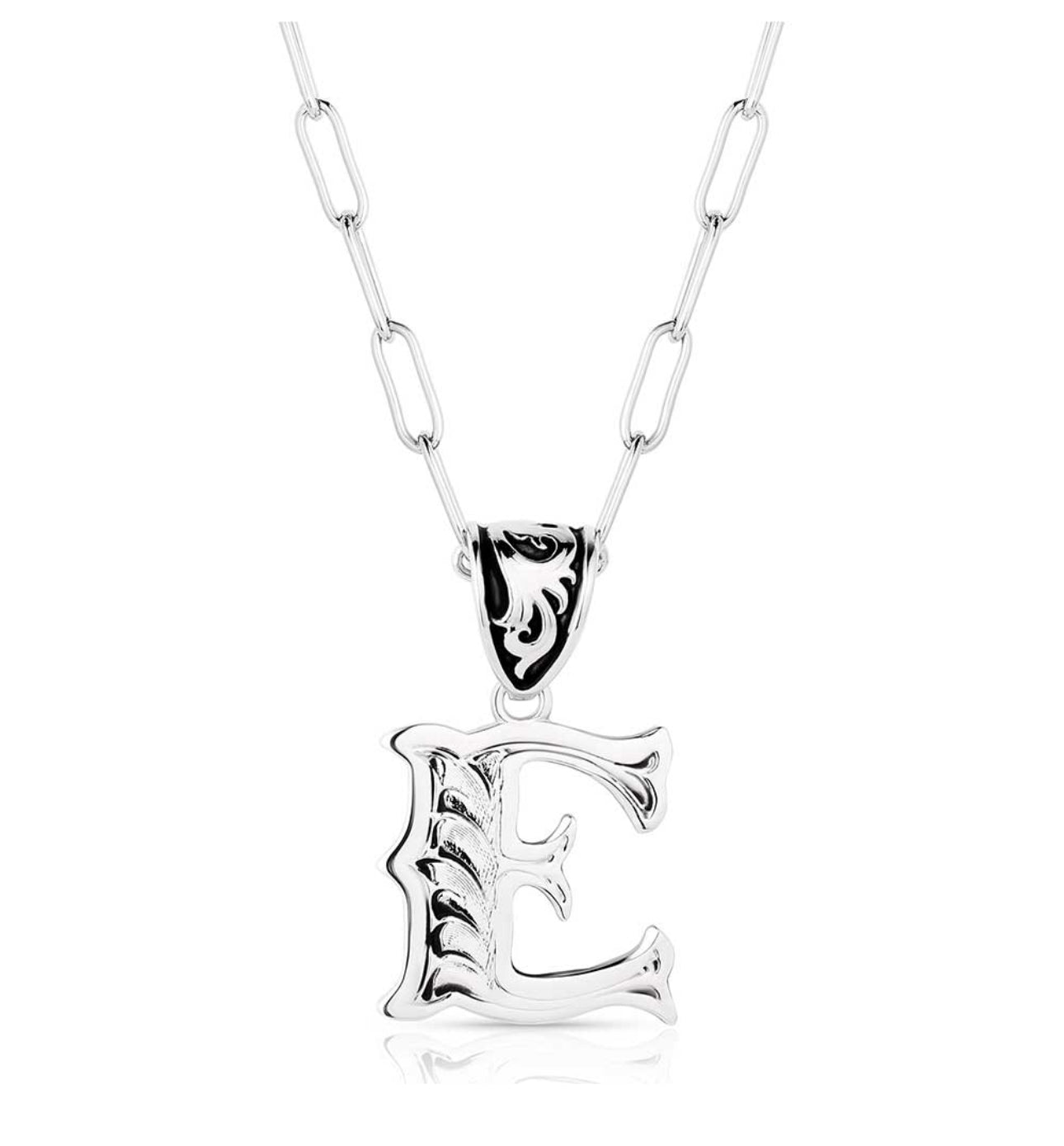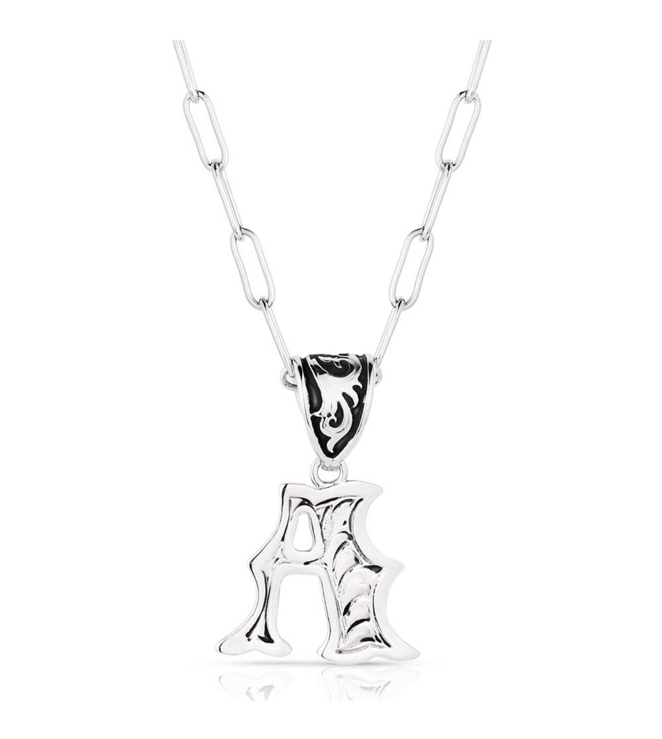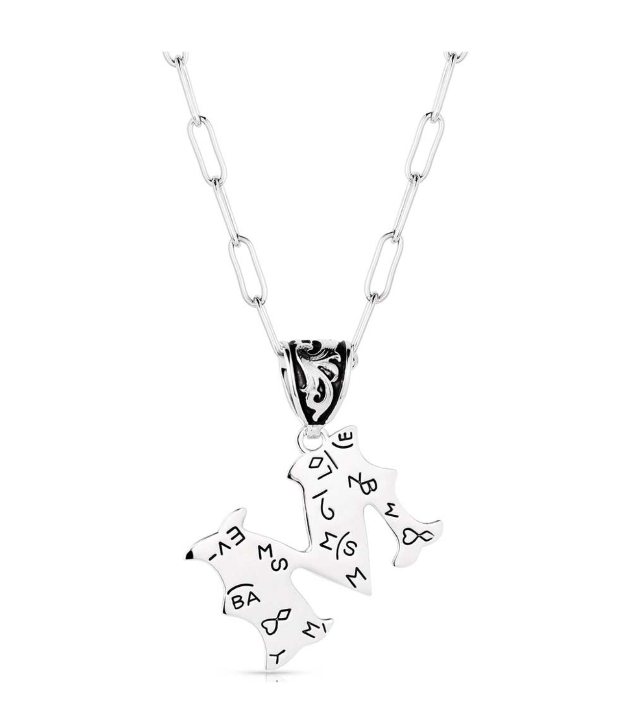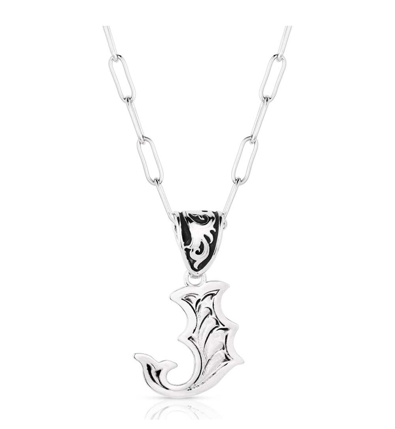 Wear an accessory as individual as you. The Western Initial necklace is silver toned and antiqued with classic engraving throughout. The pendant is attached to a paperclip chain with a fully embellished bail and black paint to make the details pop. This necklace has 18 inch adjustable chain.